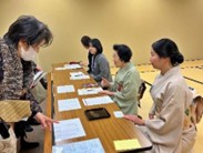 「松浦静山公と煕の情熱」を紹介する平戸モノ語りの催しの一環として行うこととなったと伺っています。そのため、茶会は九州国立博物館の行事として行われ、お知らせや参加申し込みは九州国立博物館のホームページで受け付けられ45名(一席 15 名の3席)の定員が直ぐに一杯になったと伺っています。 茶会までの準備期間は3か月余りと短く、また、師走、新年と行事の多い時期でございましたので日程調整が難しく、更に壱岐の方々にとっては冬場で玄界灘が荒れる季節でもございましたから博多に集まる日程を決めてもお天気任せで大変でございました。そのような中、皆さん快く集まっていただき、お運びの動き、水屋の配置や流れとタイミング等を実際に動いて確認し、本番をイメージして繰り返し稽古を致しました。 前日には各地域から無事茶室に集合でき、道具類も運び込まれましたので、御宗家様と奥方様をお迎えしてご挨拶をさせていただき準備開始となりました。 |