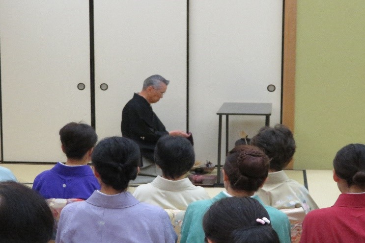 濃茶席では90歳になられる榮岩先生が矍鑠として羽織袴姿で席主を務めてくださいました。また、若い方からの声で席中でのお話が勉強になったとお聞きして喜んでおります。 |