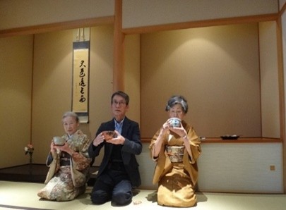 お床拝見後、場を整え少々略式になりましたが、各自で点てるお濃茶、薄茶で今年の稽古始となりました。 お茶はおいしく、お菓子も正月らしく。楽しく歓談しました。 |