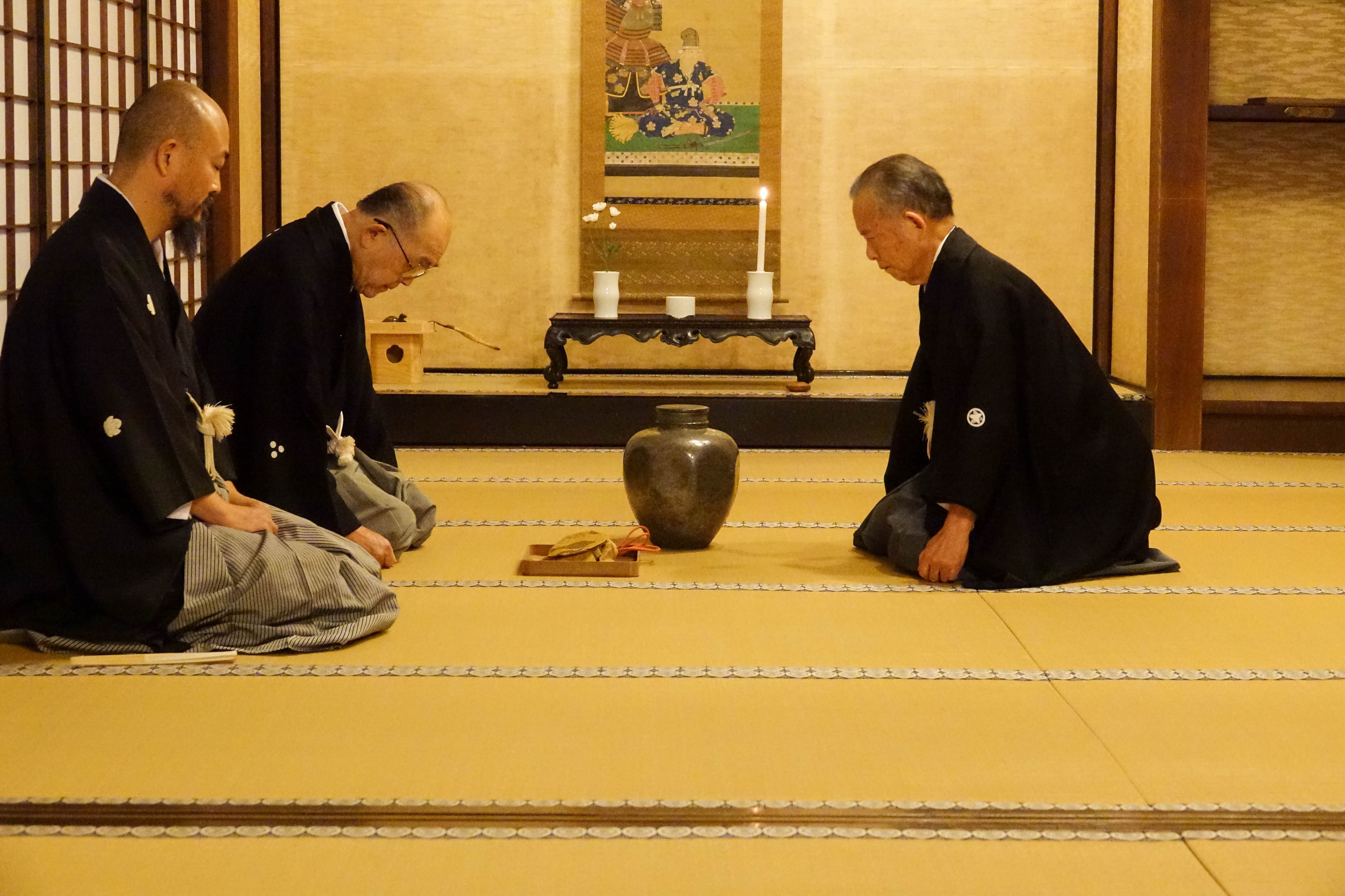 真盛寺東京別院の奥殿二間をお借りし、上段の間の床に鎮信公の御影の御軸が掛けられ、中央の卓上左側白磁の花入に鎮信公が慈しまれた白菊が楚々と入り、右側に燭台を置き、床の左側の三方に熨斗を飾りました。脇床には葉茶入りの茶壺が飾られ、茶種の記された入り日記が壺の箱の蓋裏に貼られて置かれています。上段の間の床に向かい左側には枯山水の庭を背にして御宗家様(41代)と収様(42代)が座られ、右側には御奥方様が座られています。 下段の間には、東京支部の会員諸兄姉が床に向かって座しています。 御宗家様の手で燭台のローソクに火が灯されると口切の式が始まります。 今年の口切の茶堂の役を私が仰せつかることになりました。上段の間の襖を開け折敷を持ち入り、御宗家様と向き合う処に坐りそれを置き、脇床から茶壺を下ろし、赤子を抱き抱えるように折敷の前に坐ります。茶壺は錫製で少なくとも12㎏はあり、持って立ったり坐ったりするのには慎重を要します。茶壺の紐、覆を外し、外蓋、中蓋をとり、外蓋を被せ、折敷に紐、中蓋、覆をのせます。茶壺を抱き抱えて御宗家様の御前に運び、御宗家様に内を検めていただき、次に折敷も御宗家様に見ていただきます。 |